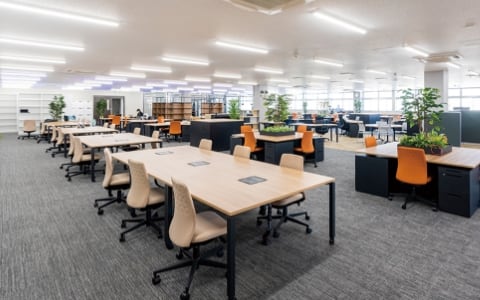 効率向上のため、その日の業務内容によってフレキシブルに場所を変えられるフリーアドレスを導入しています。